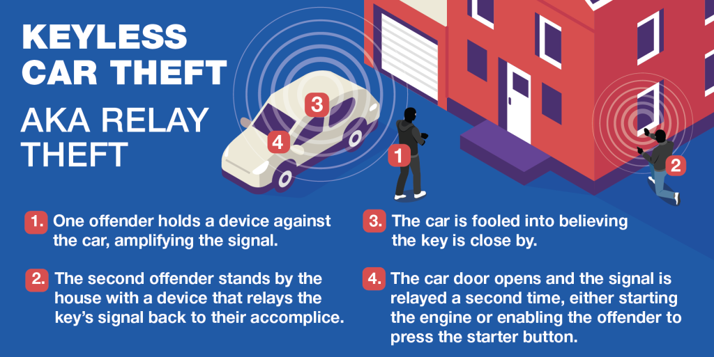 Relay theft happens when thieves use devices to intercept and amplify the signal from your key fob, even when it’s inside your home. This allows them to unlock and start your car within seconds.